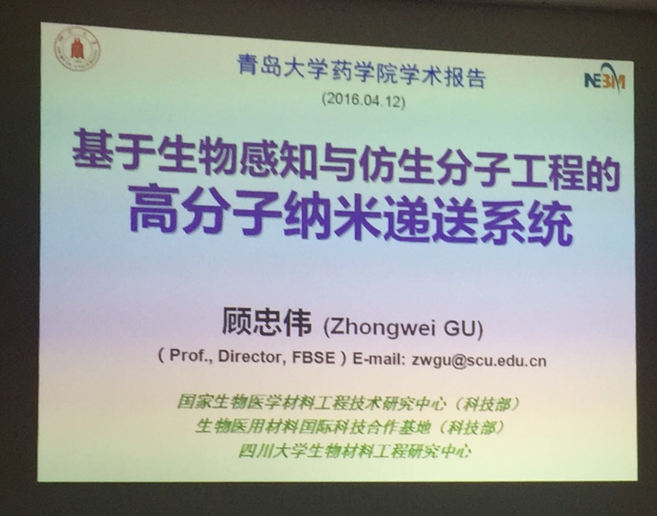国家生物医学材料工程技术研究中心主任、国家“973”计划生物材料领域首席科学家顾忠伟教授应我校药剂学科邀请来我校博彩网站 进行学术交流。412日上午,顾忠伟教授在登州路校区博彩网站 三楼会议室做了题为《基于仿生分子工程的高分子纳米递送系统》的学术报告,博彩网站 王克威、李英霞、王威、王继波等教授以及数十名博士、硕士研究生参加了这次学术报告会。报告会由我校药剂学科负责人孙勇教授主持。