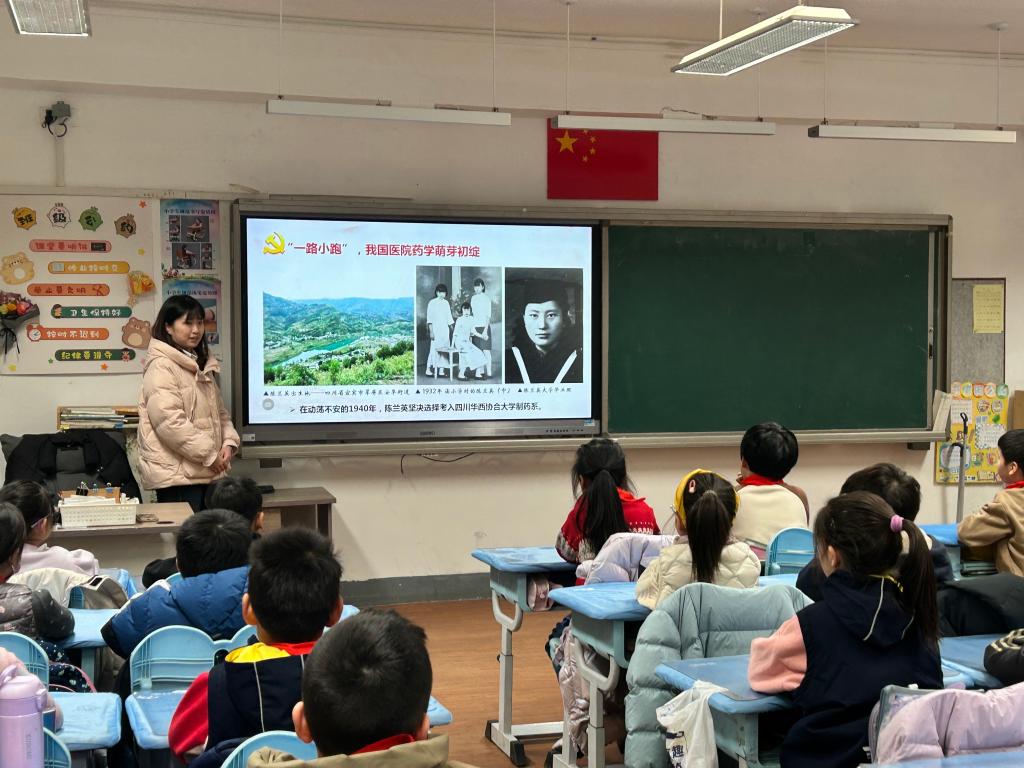 党委副书记雷舒涵,辅导员仇启荣、杨浩,药学青年先锋青年宣讲团成员周婉婷、张祎一、何盼一行赴大学路小学,为小学生讲述医药行业杰出人物的先进事迹。